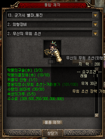 재료는 악몽의 구슬(수) 3, 악몽의 결정체(수) 10, 귀멸의 인형 1, 영웅의정수(무희 초선) 100, 수령의 비마석 30, 속성의 가루 5, 수수료 3억 이 들어갑니다.
